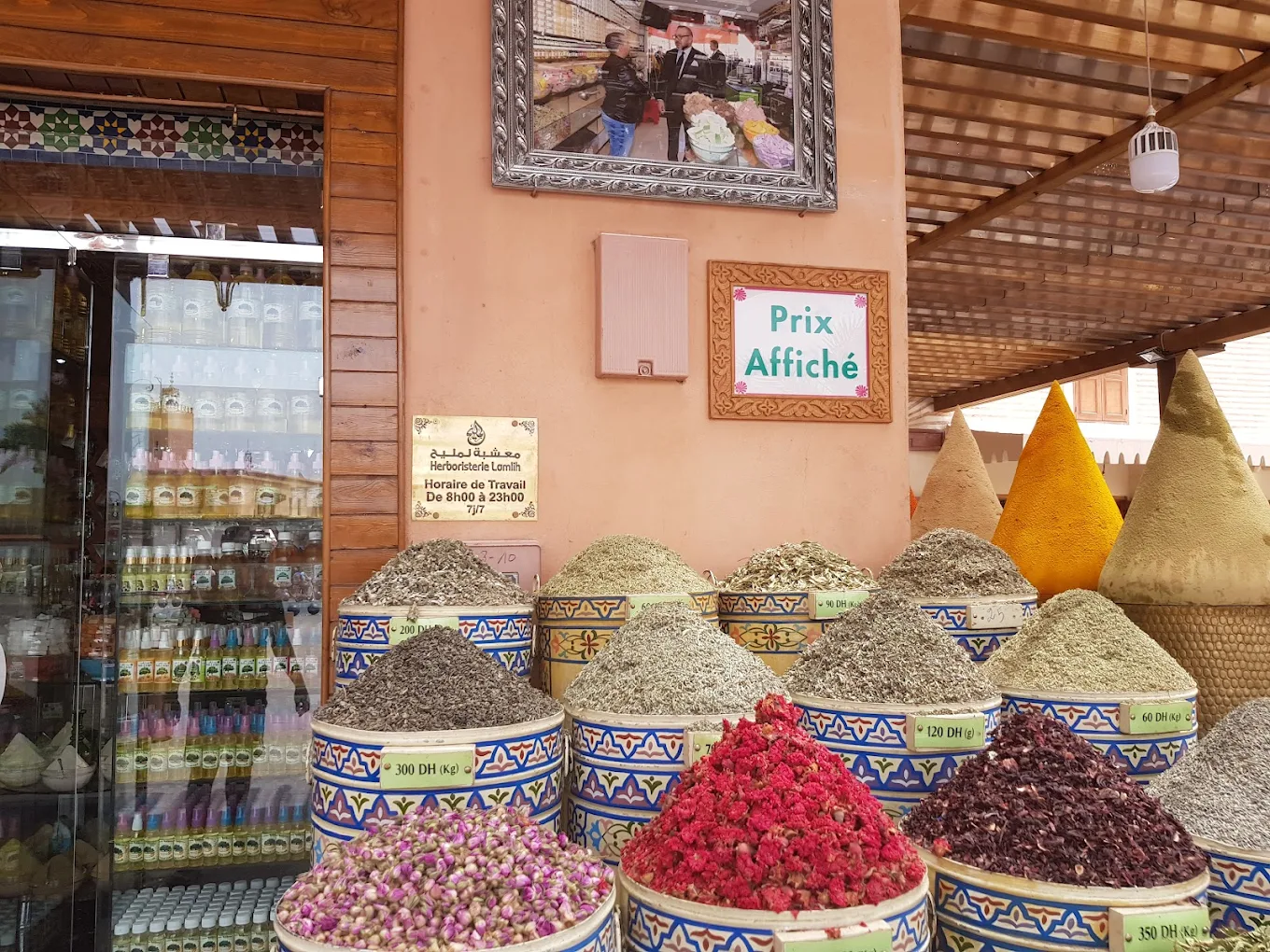 Outre la beauté du lieu, vous y trouverez des produits typiques à des prix variés : épices rares, huiles naturelles, encens, cosmétiques traditionnels et objets artisanaux. C’est l’endroit idéal pour ramener des saveurs authentiques ou découvrir les secrets des remèdes ancestraux marocains.