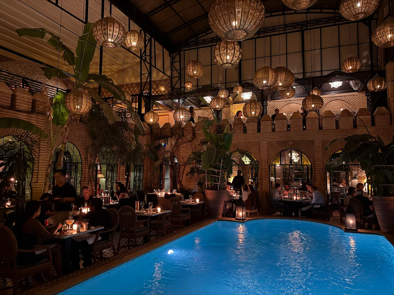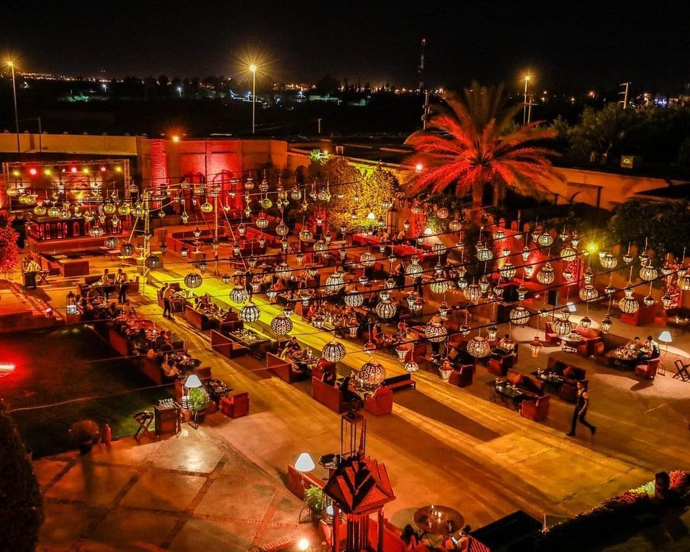 Je vais commencer cette sélection avec Dar Soukkar, l’une des adresses les plus spectaculaires de la route de l’Ourika. Installé dans un ancien palais sucrier réhabilité, le lieu impressionne par ses volumes, son décor oriental grandiose et son ambiance à la fois chic et festive.
