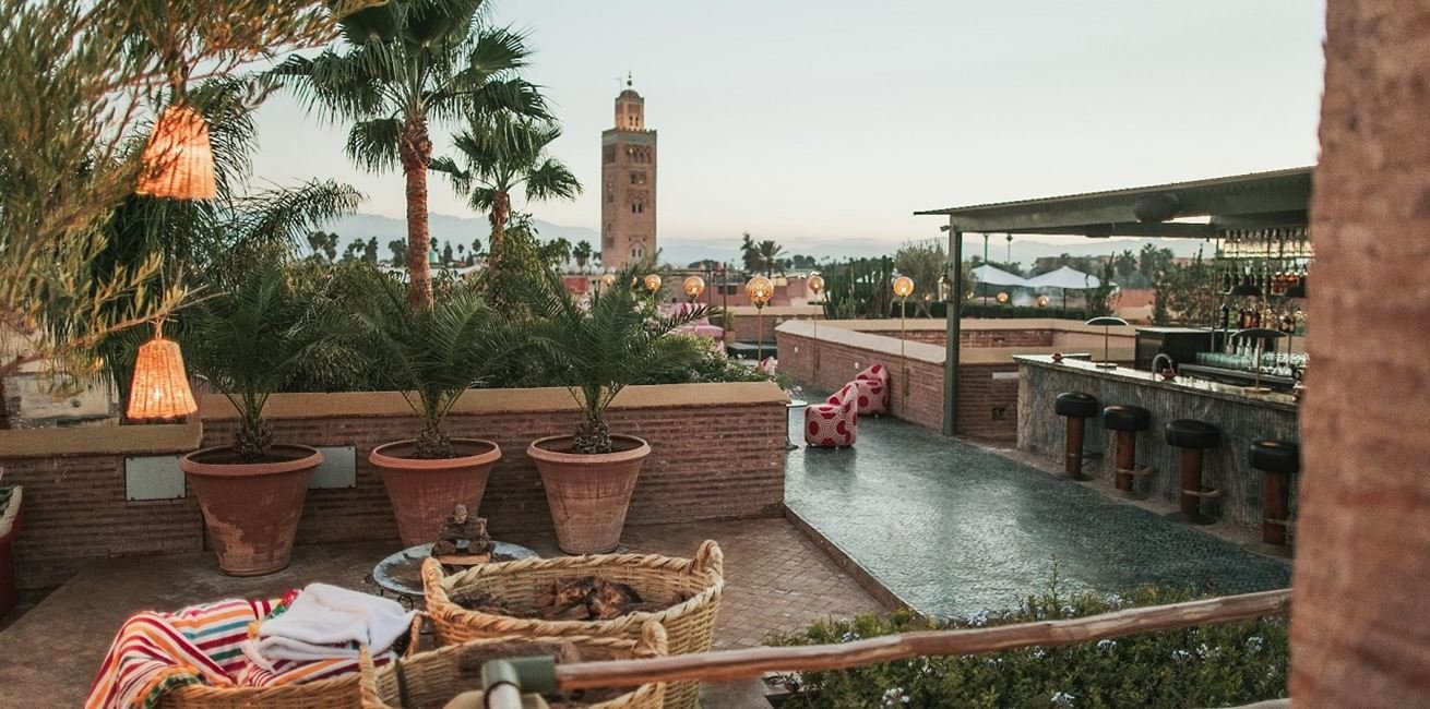 Réputée pour son atmosphère vibrante, son architecture ocre et son art de vivre unique, la ville séduit autant par ses ruelles historiques que par ses adresses perchées. Entre médina animée, quartiers contemporains et hôtels confidentiels, certains établissements offrent des toits-terrasses spectaculaires, parfaits pour admirer les remparts, les minarets et les sommets enneigés de l’Atlas à l’horizon.