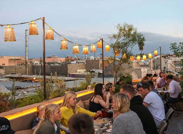 Dar Dar est l’un des rooftops les plus dynamiques et en vogue de la médina. Niché à quelques pas de la Place Jemaa el-Fna, cet établissement combine restaurant, bar et ambiance festive dans un décor moderne et chaleureux. C’est l’une des adresses les plus appréciées pour profiter d’un rooftop animé avec vue sur les toits ocre et les minarets environnants.